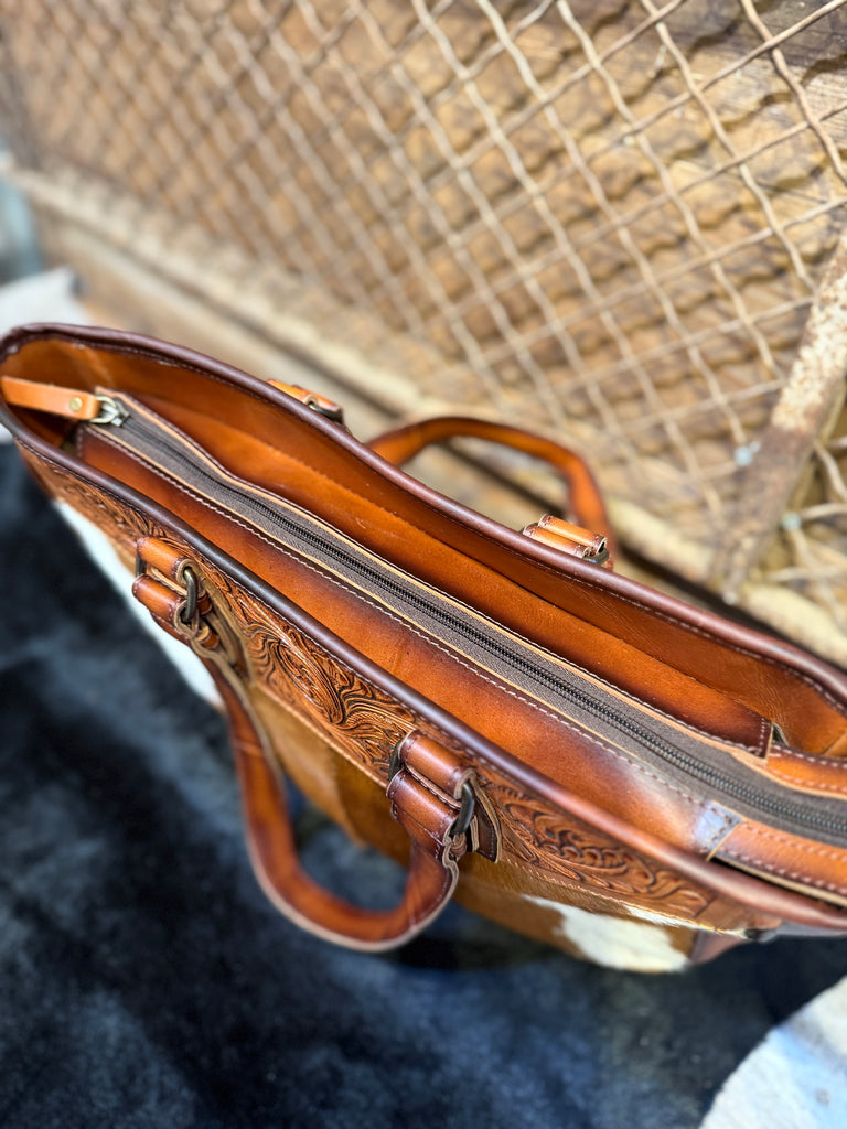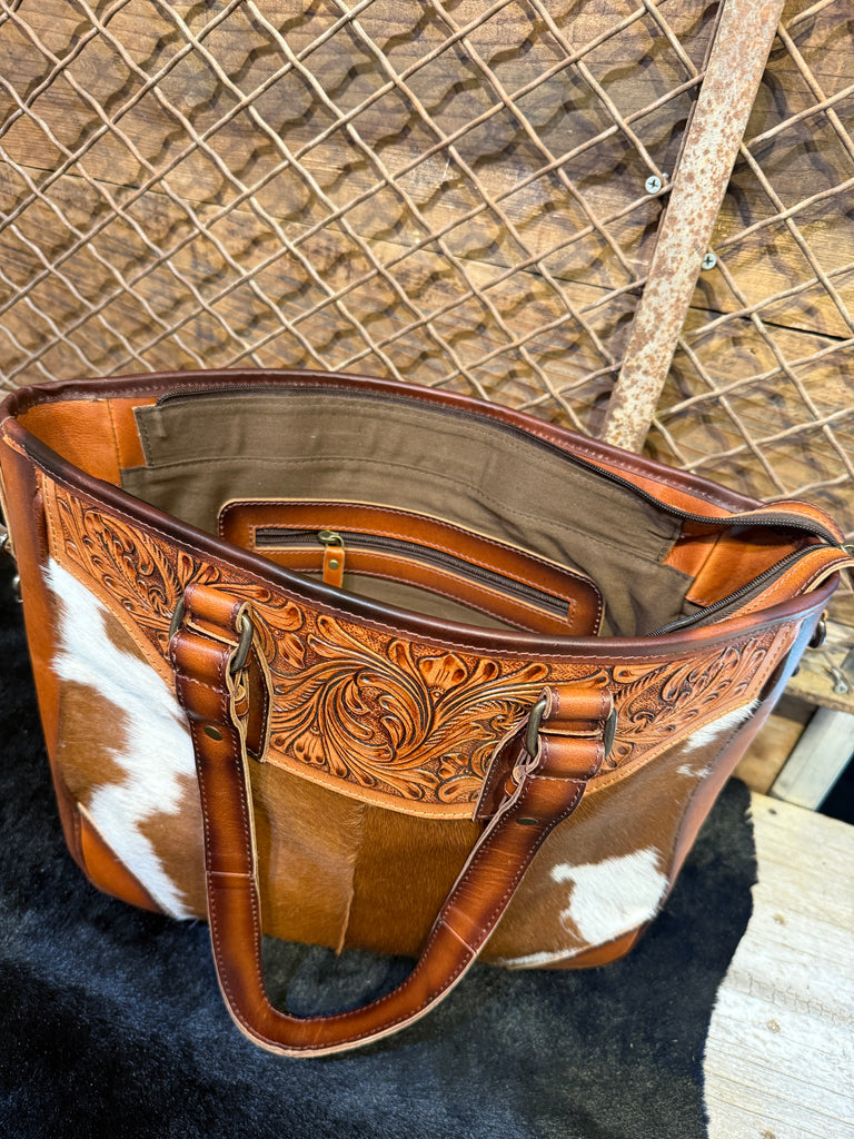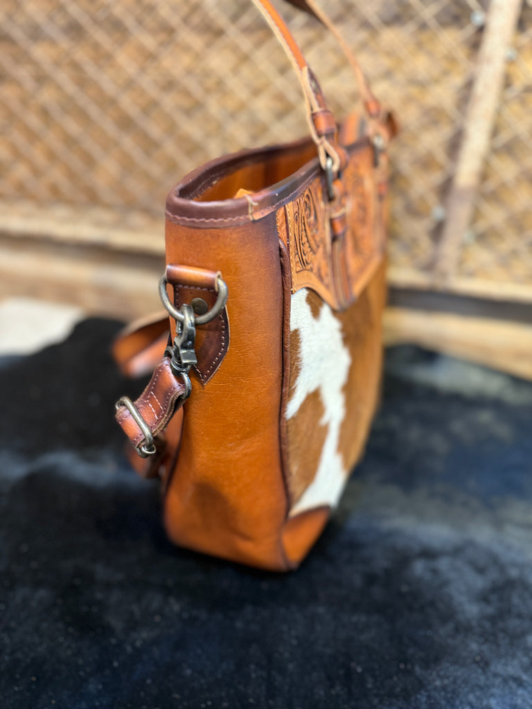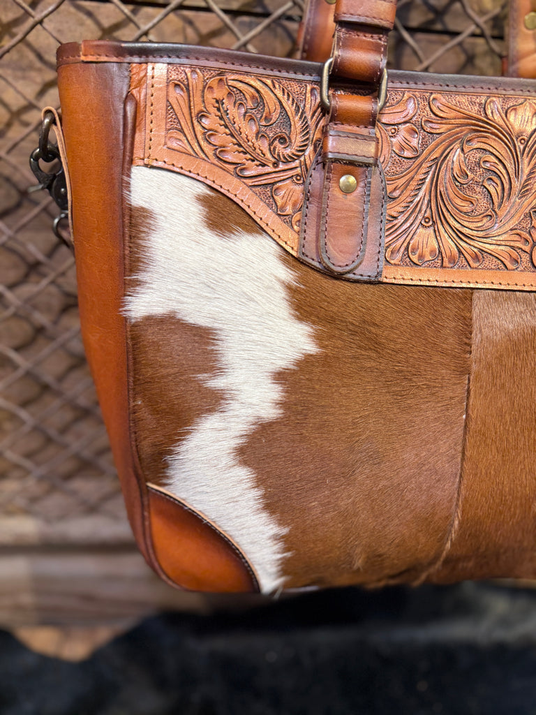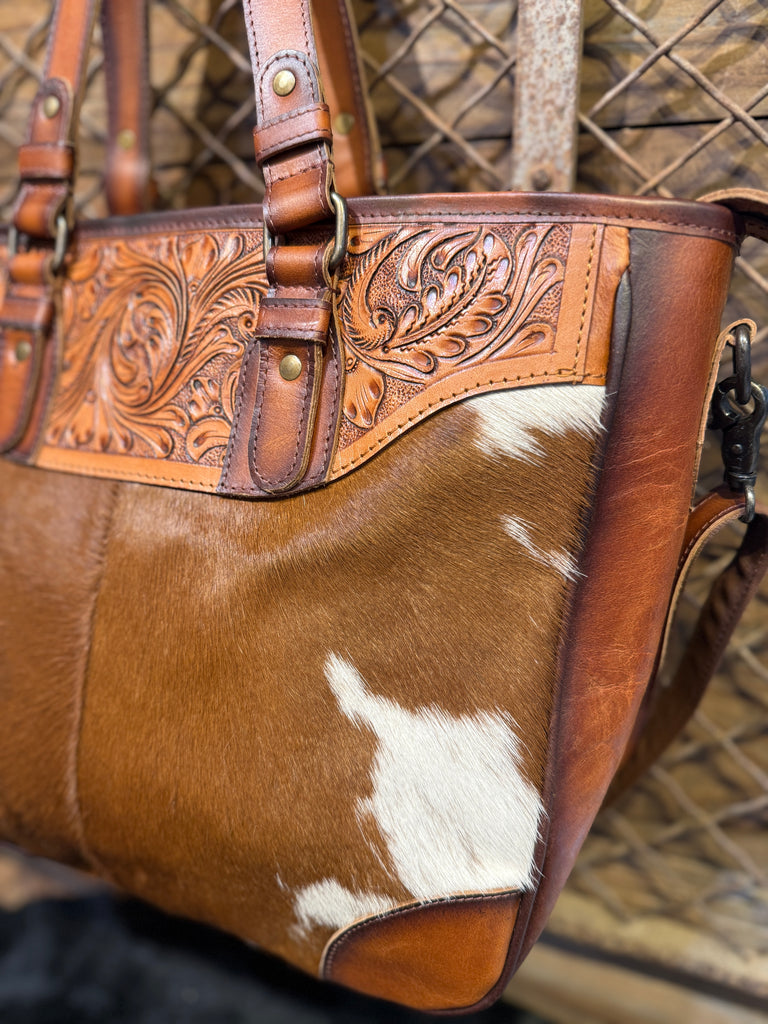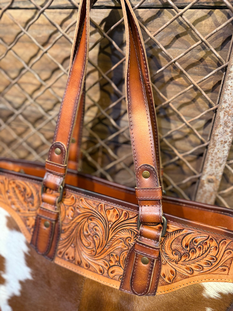 Introducing our Western Hand Tooled Leather and Cowhide Tote Bag, a perfect blend of rustic charm and modern functionality. Each bag is meticulously crafted from high-quality leather, featuring intricate hand-tooled designs that showcase true artisan skill. The genuine cowhide accents add a touch of rugged elegance, making each piece unique with its natural variations.