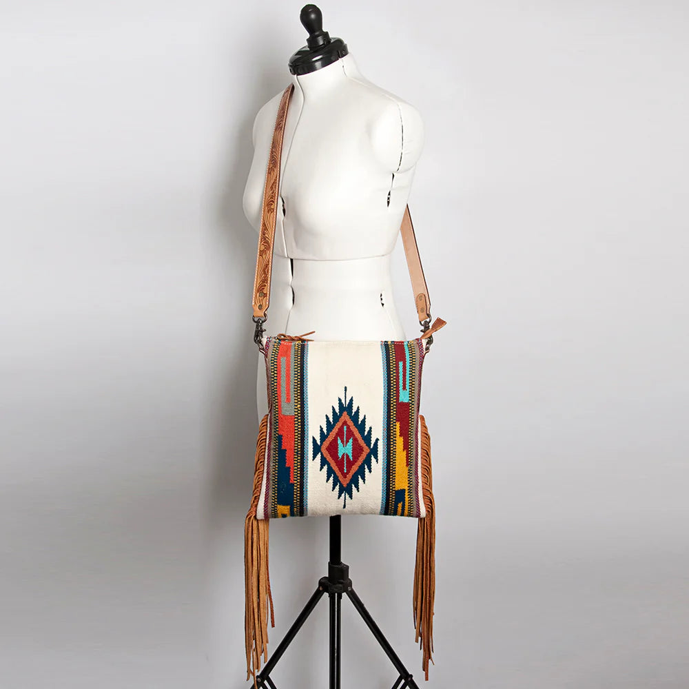 Capture the vibrance of Western heritage and handmade artistry with the Sally Southwestern Wool & Leather Messenger Bag by American Darling. Handcrafted in Texas, this bold and functional piece features a rich wool saddle blanket in radiant sunset hues—woven with precision and passion.