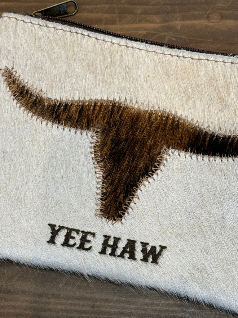 Medium YEE HAW Longhorn Cowhide Zipper Bag Coin, Cosmetic, Travel Purse
