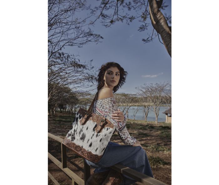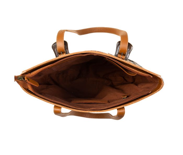 This alluring features a front of hair-on hide with beautiful accents of detailed, hand-tooled leather in a timeless pattern. The reverse is warm deep caramel leather, with zippered pocket. Spacious interior features handy section, a zipper-close top, and matching carrying handles. A striking bag for any occasion!