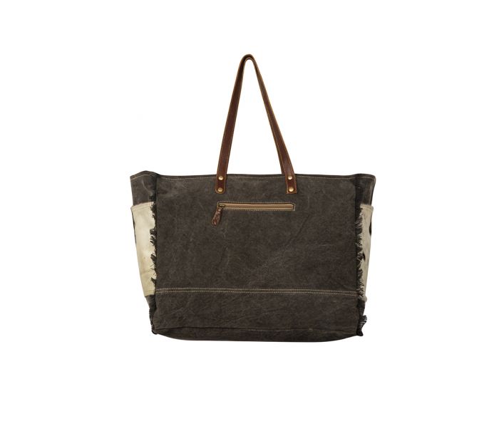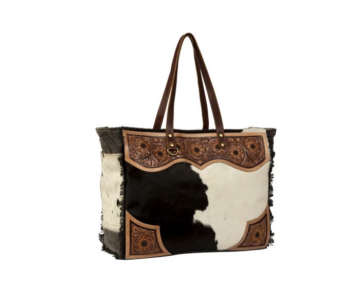 This spacious bag features great design and utility all in one. A scalloped top panel of hand-tooled leather in warm caramel compliments the beautiful hair-on hide. The interior features a zippered pocket and zipper close top. Convenient pockets on each end offer convenience. The back is smoky charcoal woven canvas with frayed-edges treatment and separate zippered pocket. Matching durable leather carrying straps.