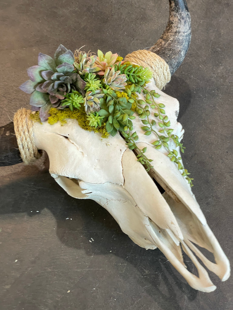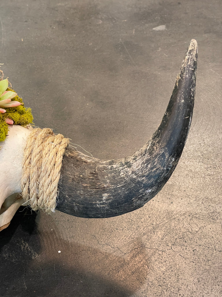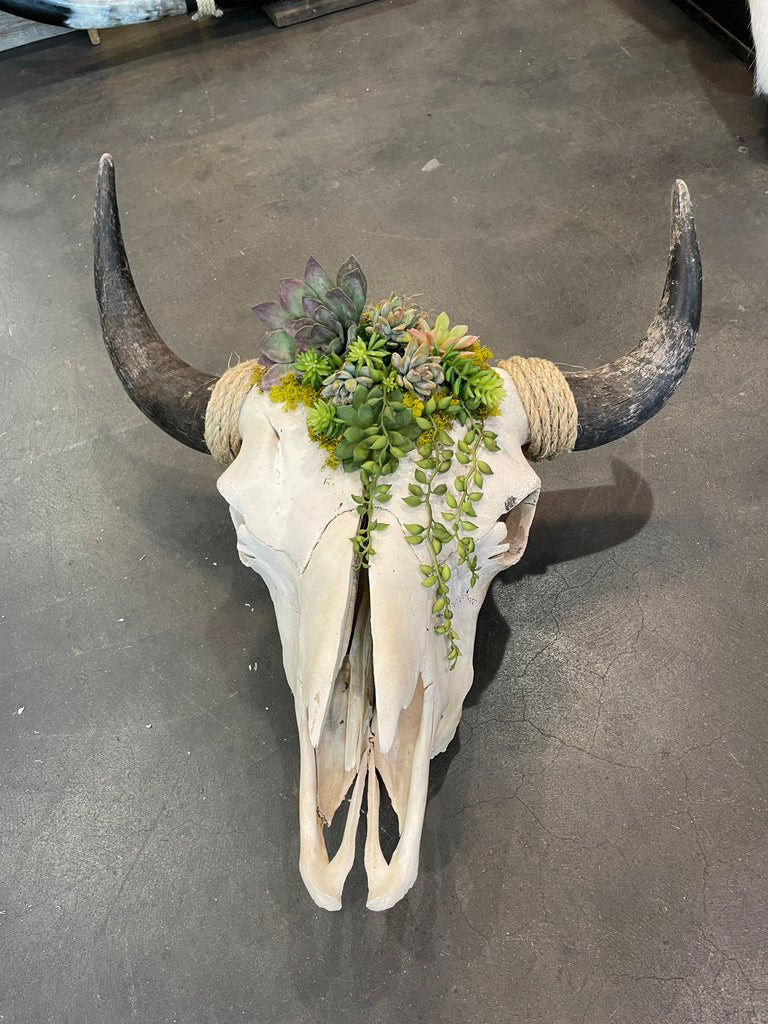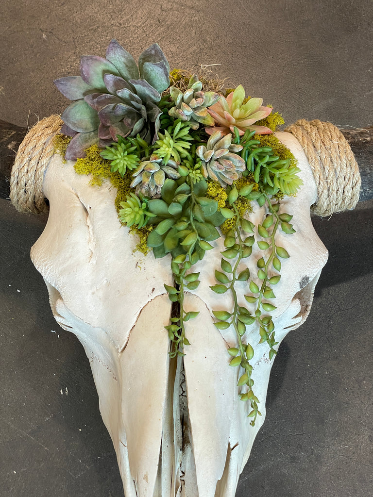 Authentic Buffalo Wall Mounted Skull with Succulents. This is a gorgeous one of a kind statement piece to hang in your home or business.