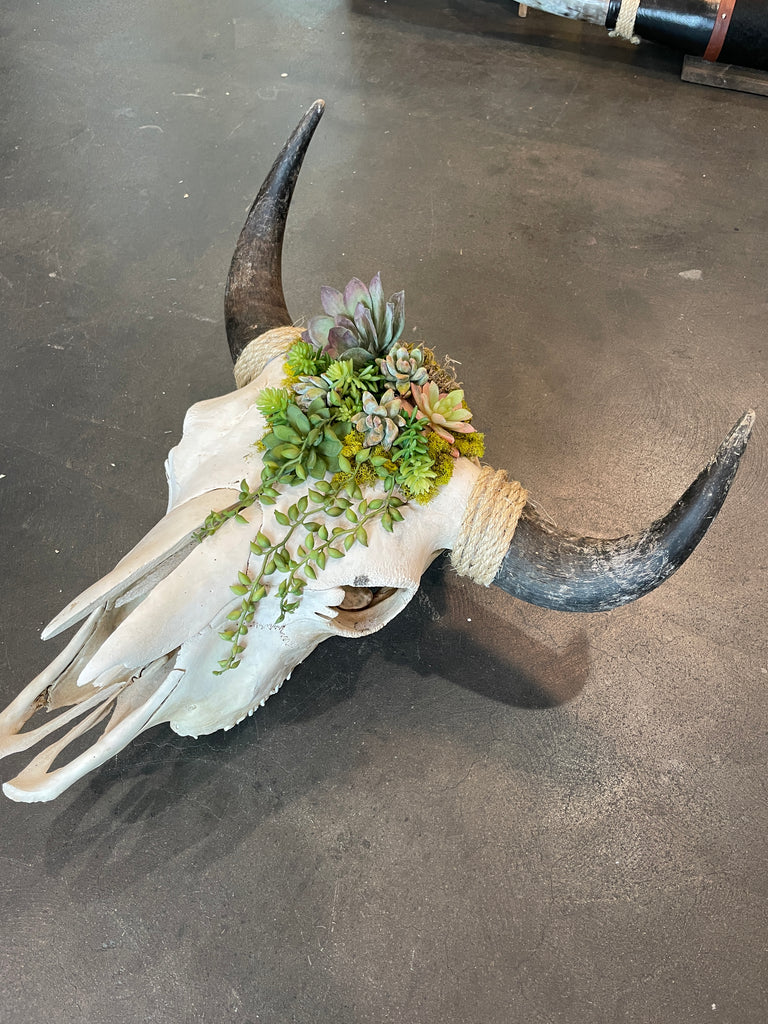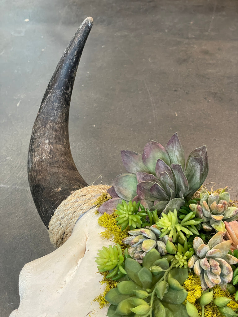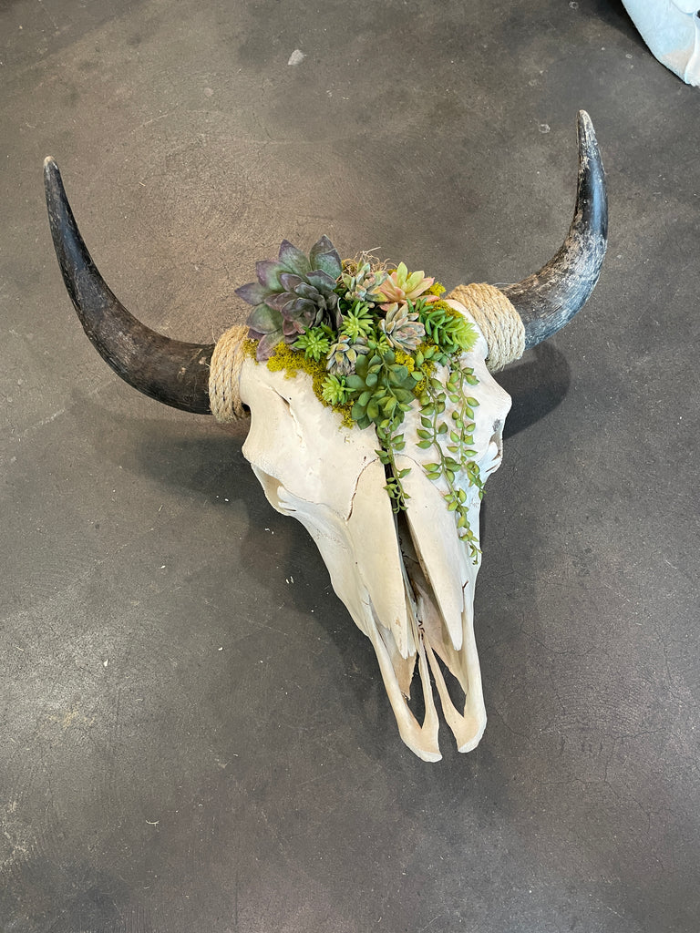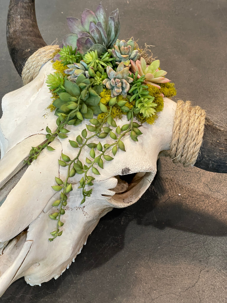 Authentic Buffalo Wall Mounted Skull with Succulents. This is a gorgeous one of a kind statement piece to hang in your home or business.