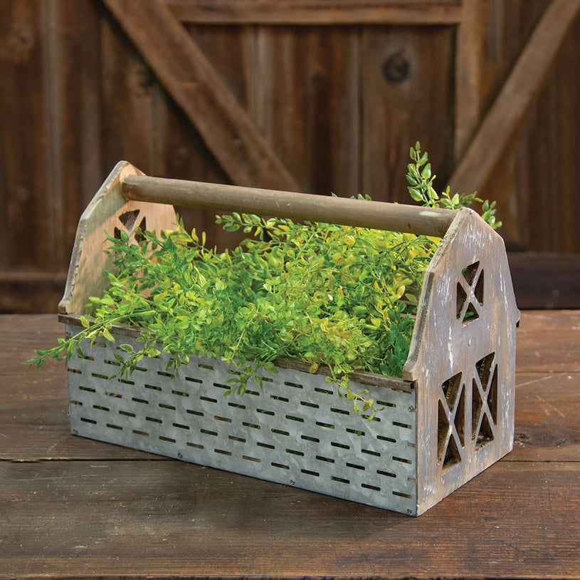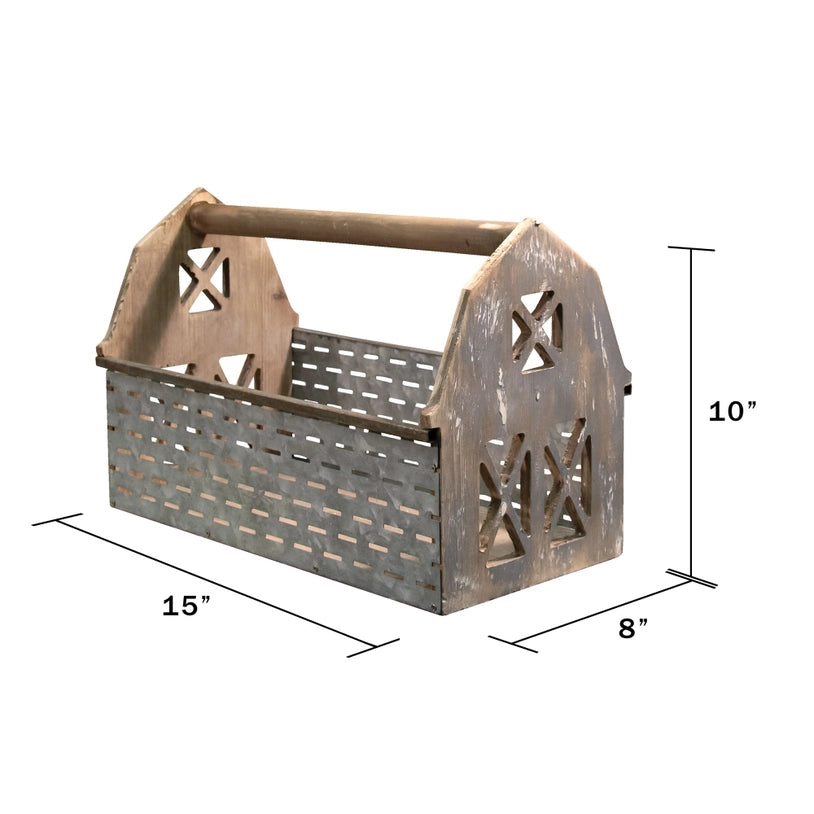 Olive Bucket Barn Wooden Basket is a new take on a storage basket. Basket has a wood bottom and galvanized metal sides with a punched hole pattern that mimics the style of an olive bucket. Each end of the basket is made to look like the front of a wood country barn, complete with window and door cut outs. The two sides of the basket are linked together with a wooden dowel that serves as a carrying handle. Fill with books, kitchen supplies, or sit on the back of a toilet to hold tissues and toilet paper; baskets are a multi-purpose item! Measures 15" wide by 10" high and 8" deep.