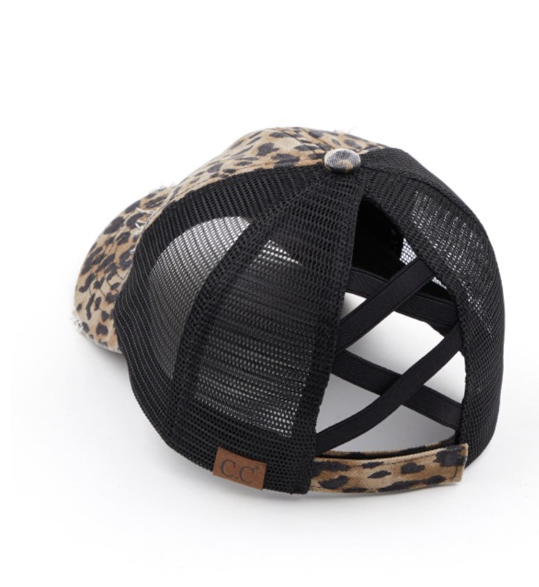 Distressed Leopard Print Criss Cross Pony Cap with Mesh Back