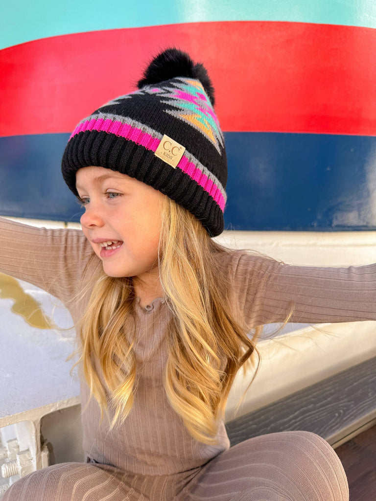 CC KIDS Aztec BEIGE BROWN Pom SOUTHWESTERN Patterned Fur Pom C.C Beanie Tan KD-HTE0030 Western