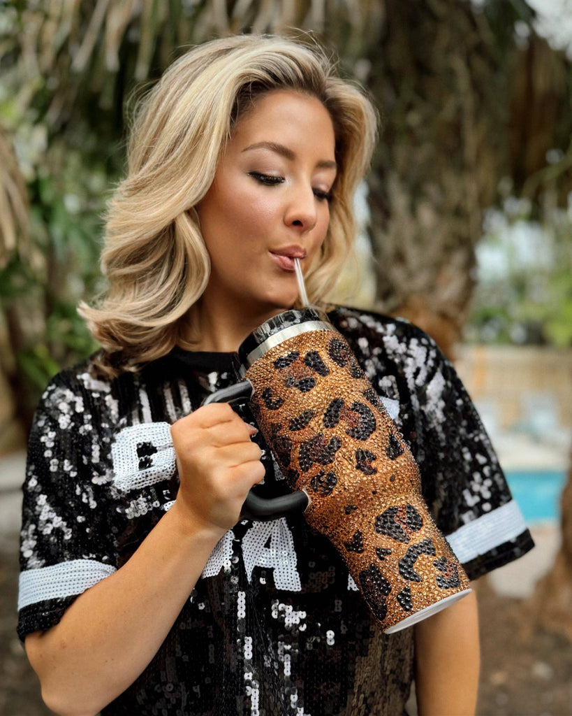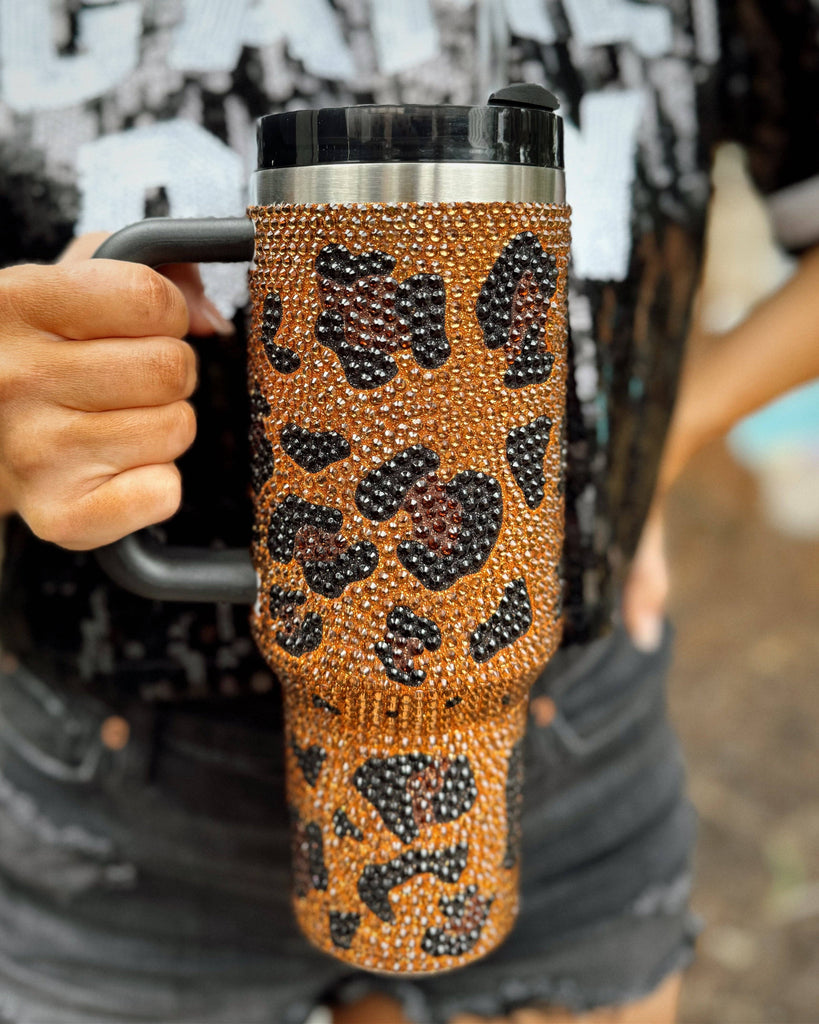 50% OFF LEOPARD RHINESTONE 40oz Double Wall Stainless Steel Vacuum Tumbler With Handle
