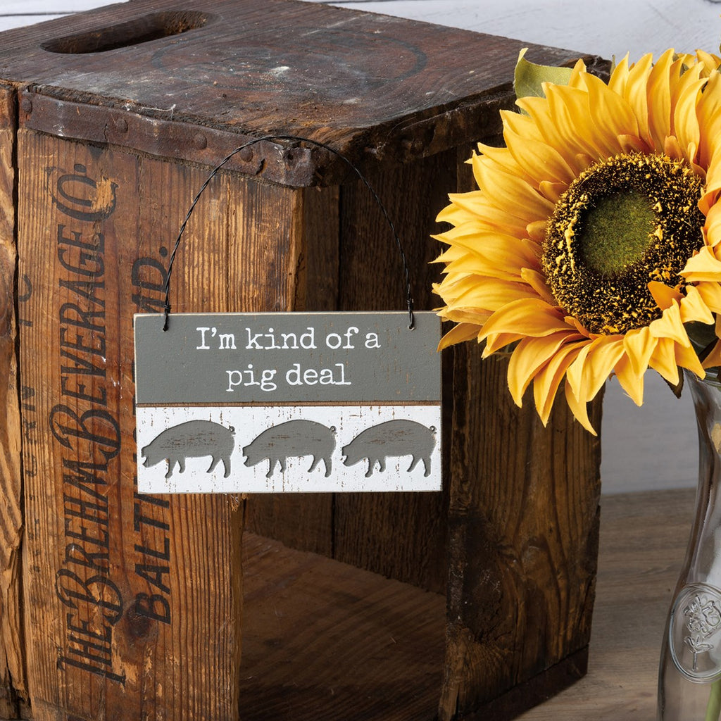 A rustic slat wood ornament featuring a typeset "I'm Kind Of A Pig Deal" sentiment and pig designs. Our I'm Kind Of A Pig Deal ornament easily hangs by twisted wire loop.