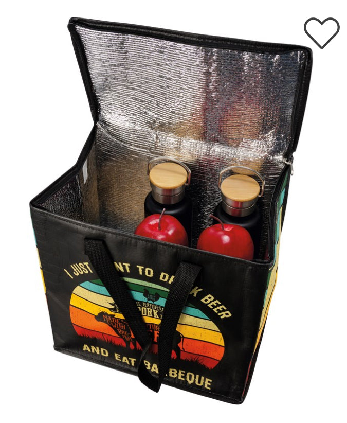 Made of post-consumer material, this double-sided insulated tote features multicolored farm animal and stripe designs and "I Just Want To Drink Beer And Eat Barbeque" sentiment. Keeps items hot or cold. Includes nylon straps and top zipper. Wipe Clean.
