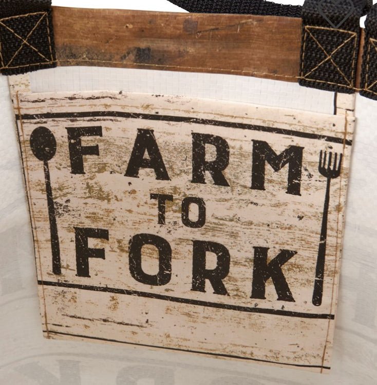 A double-sided market tote displaying rustic style designs of farm animals and eating utensils with a sentiment that reads "Eat Farm To Fork" and other farm-themed sentiments. Side gussets display coordinating check pattern. Market tote includes both hand and shoulder straps in black nylon and a convenient inside pocket. Our Farm To Fork market tote is made from eco-friendly post-consumer material and folds flat for easy storage. A fun farm-themed accessory perfect for everyday shopping or traveling.
