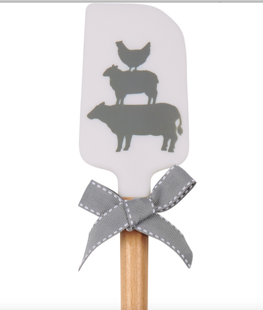 A double-sided silicone spatula displaying farm animals stacked in a gray silhouette on one side and gray gingham pattern on the other. Our Farm Friends spatula includes a complementing decorative bow and hole at the bottom for hanging. Hand-wash recommended; not microwave safe. A charming everyday kitchen accessory.