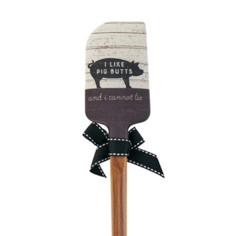 A double-sided silicone spatula displaying a rustic design of a pig with "I Like Pig Butts And I Cannot Lie" sentiment. Our I Like Pig Butts spatula includes a complementing decorative bow and hole at the bottom for hanging. Hand-wash recommended; not microwave safe. A fun everyday kitchen accessory.