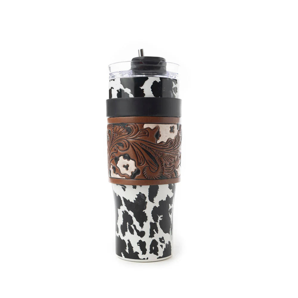 S-12054 Black & White Cow Print with Tooled Leather Laced Wrap 40oz Tumbler
