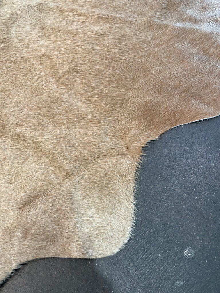 4'7" x 5' Golden Blonde Cowhide Rug #20, looks almost like it has a shimmer to the hide.