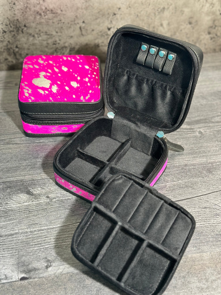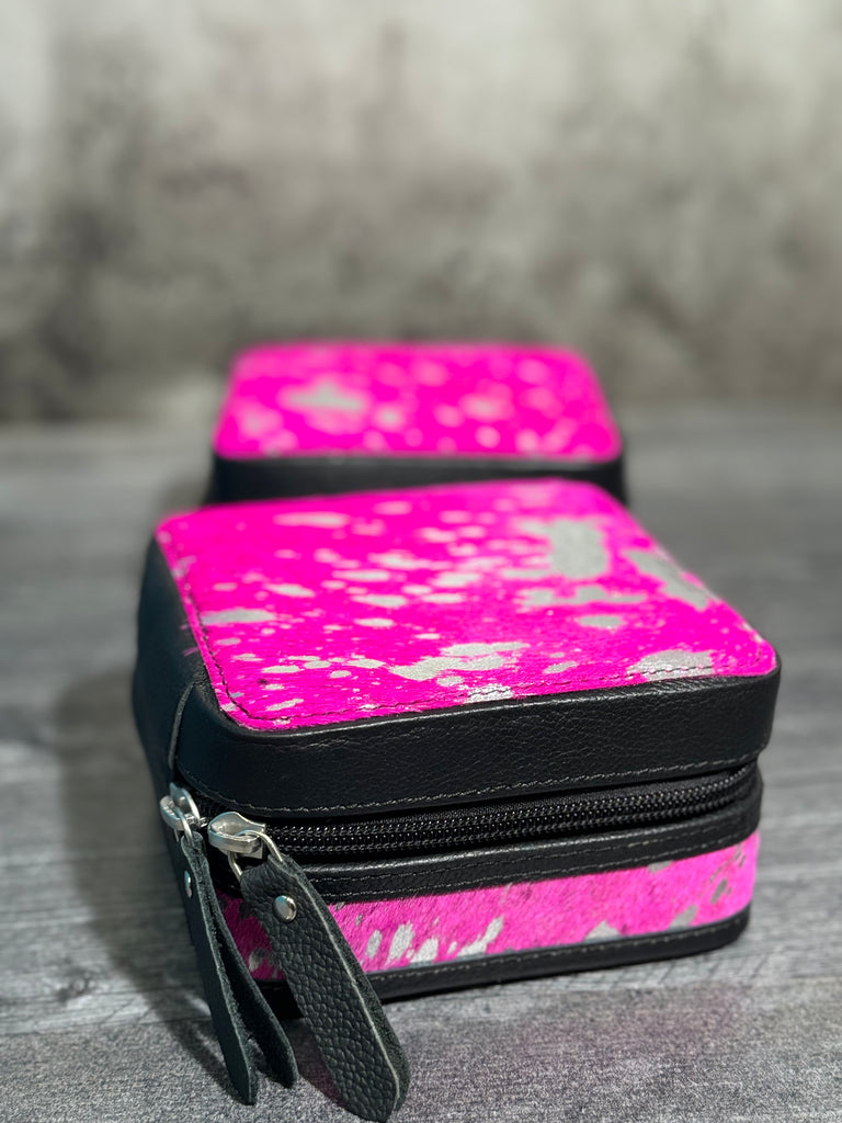 Hot Pink & Silver Cowhide & Leather Square Jewelry Travel Box