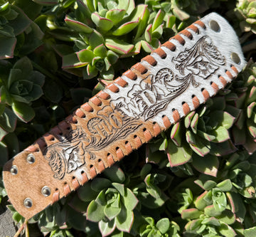 SALE 50% OFF Engraved Cowhide & Leather TOOLED HOWDY Laced Cuff Bracelet