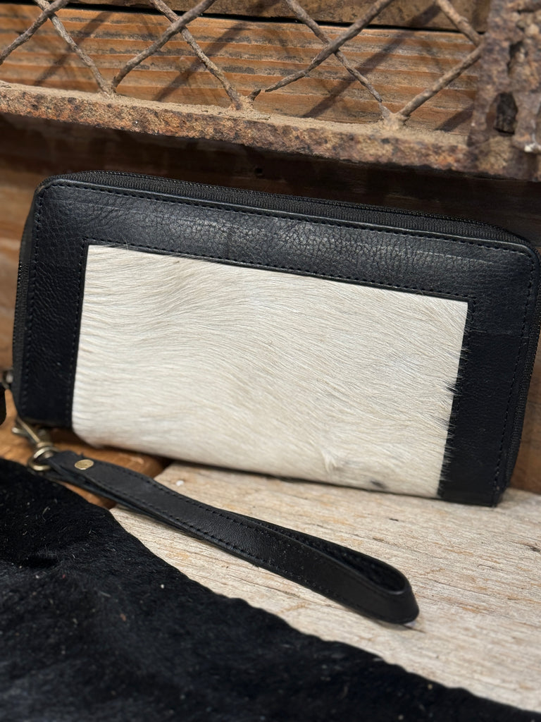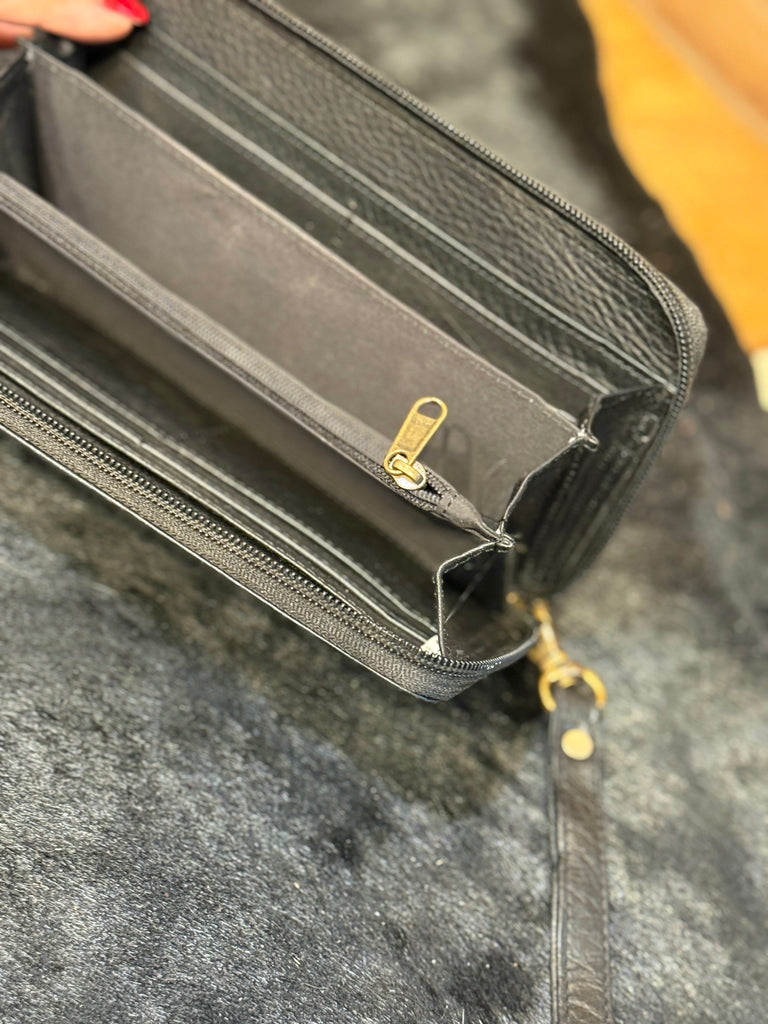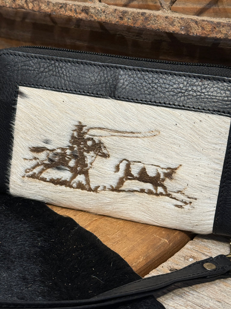 ENGRAVED Premium Leather COWBOY ROPING BULL Black Cowhide Full Zip Around Large Wallet Wristlet