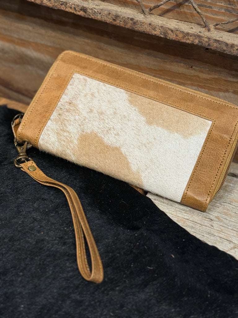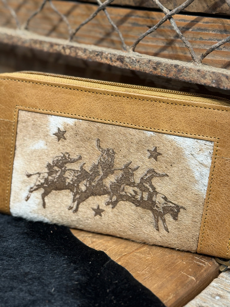 ENGRAVED Premium Leather COWBOY BULL RIDER BUCKING Brown Cowhide Full Zip Around Large Wallet Wristlet
