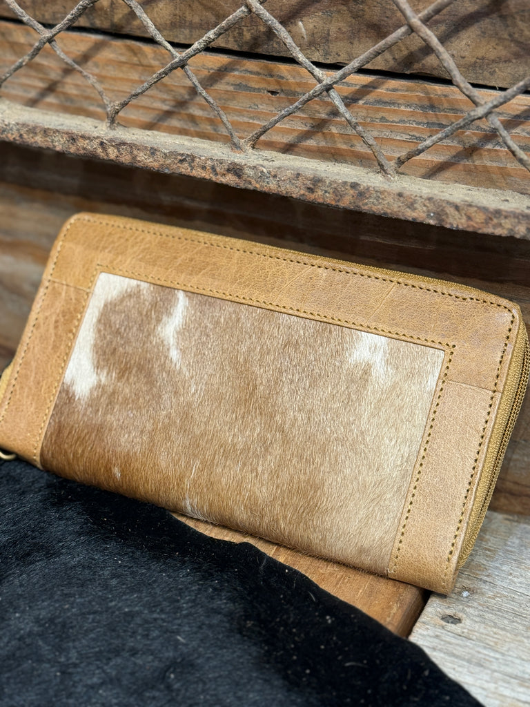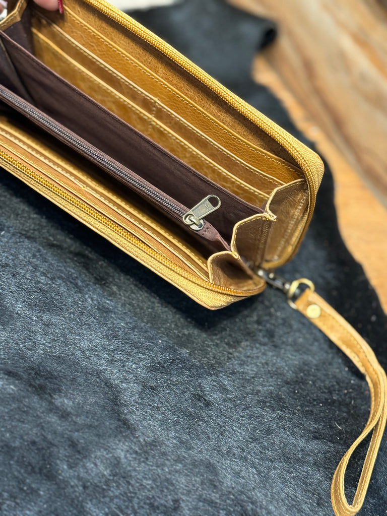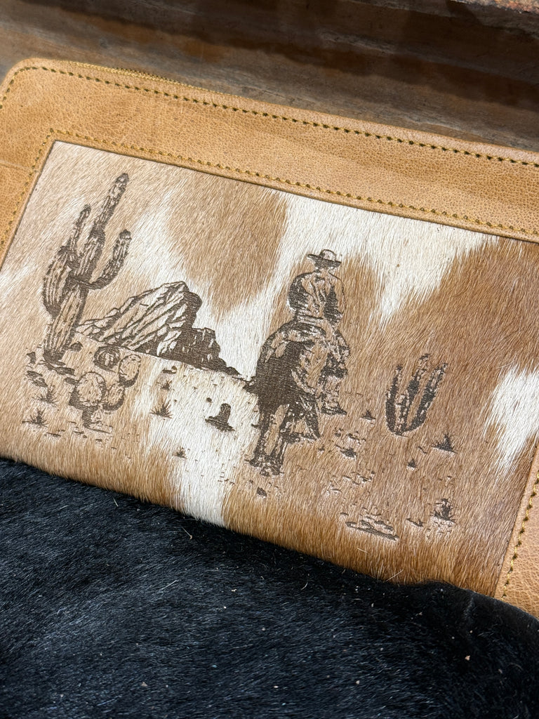ENGRAVED Premium Leather COWBOY CACTUS DESERT HORSE RIDING Brown Cowhide Full Zip Around Large Wallet Wristlet