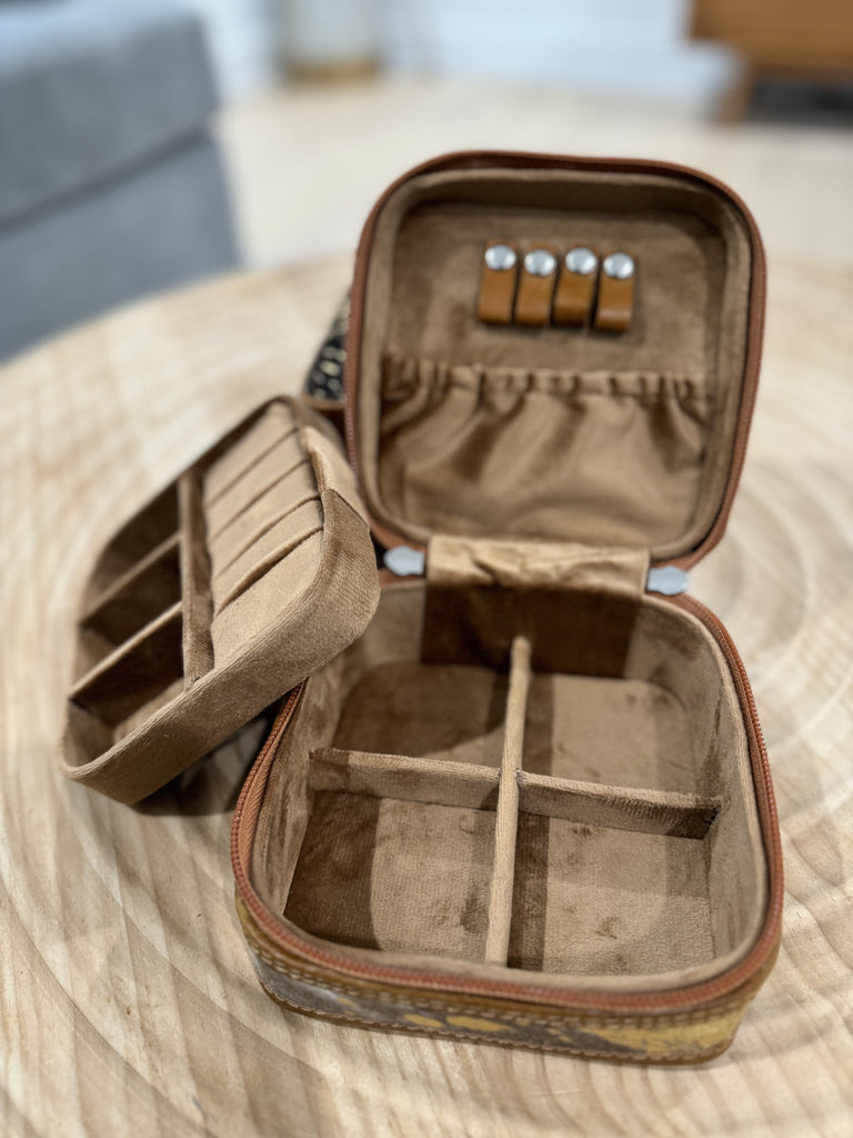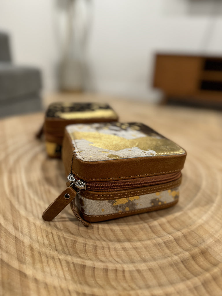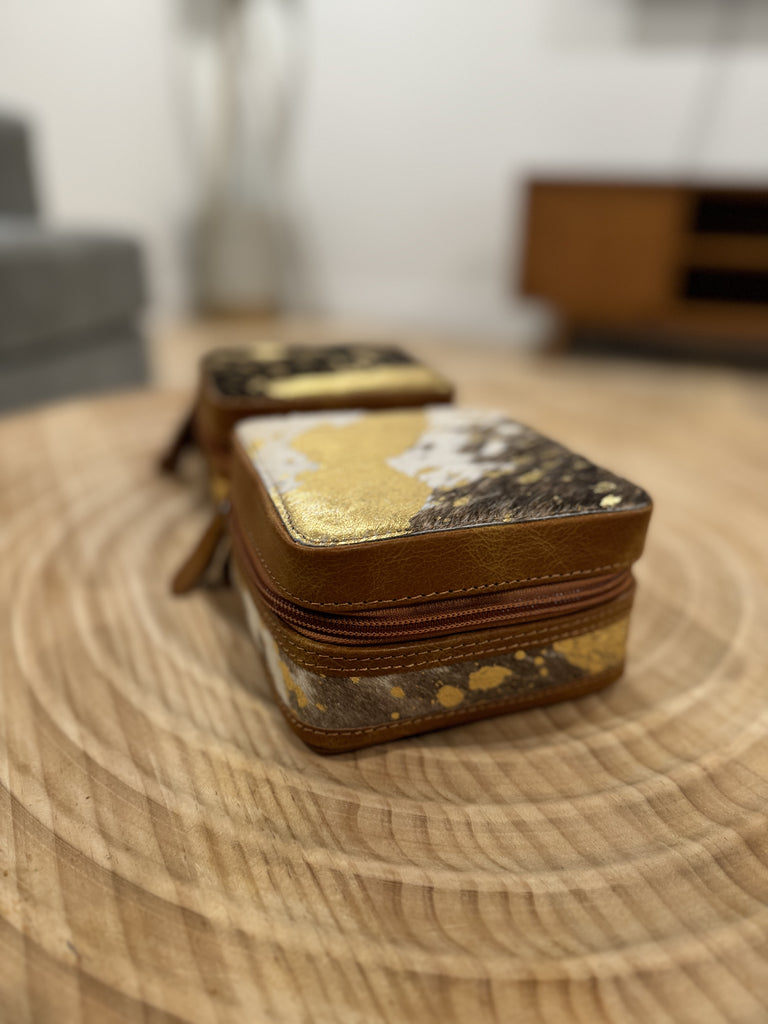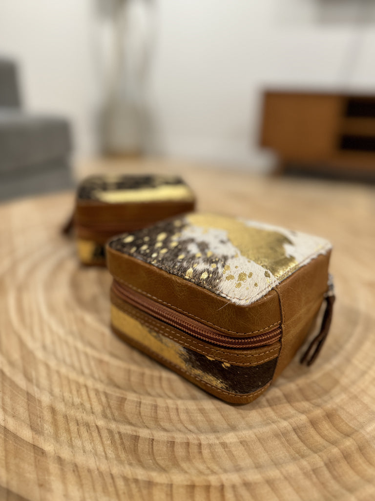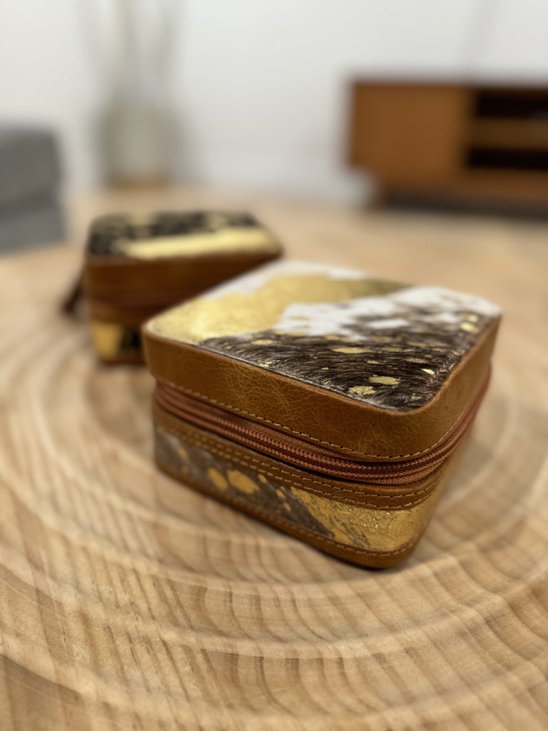 Gold Cowhide & Leather Square Jewelry Travel Box