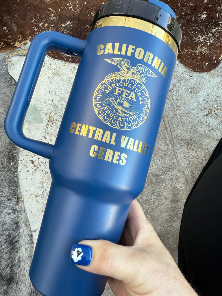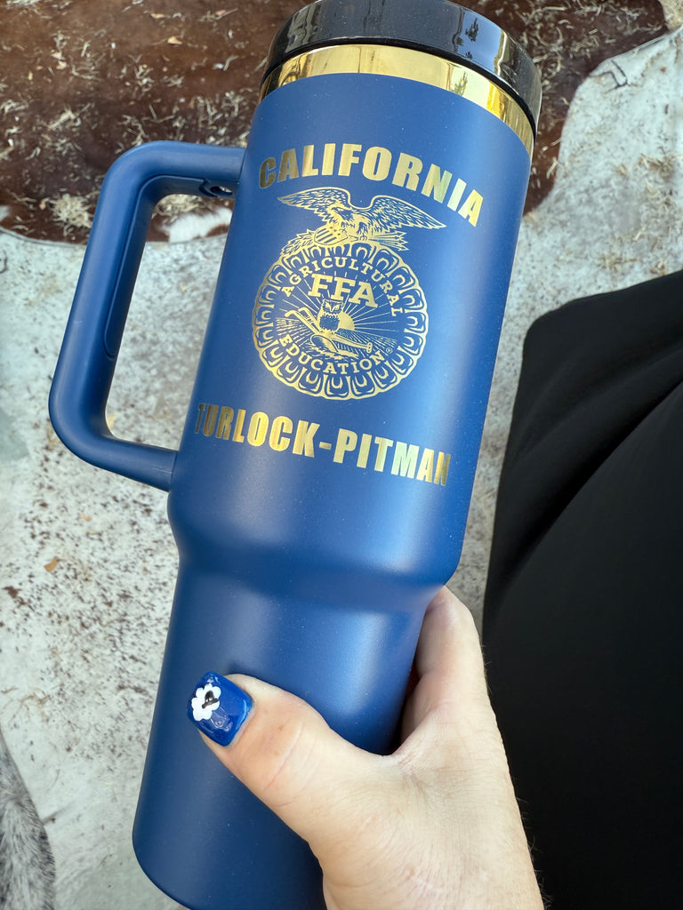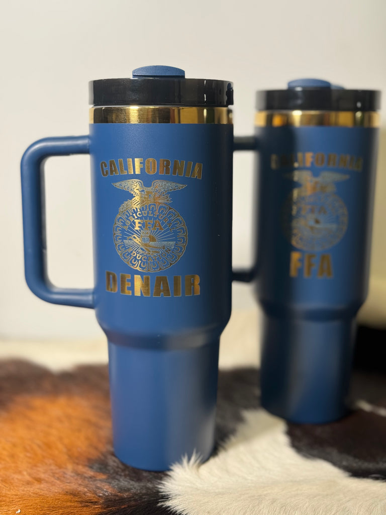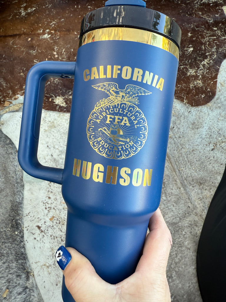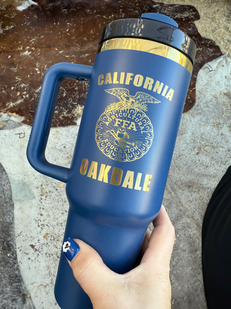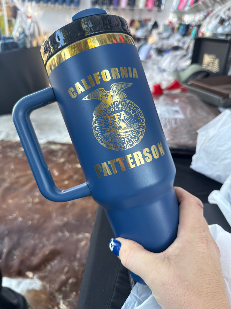 CUSTOM SCHOOL FFA Laser Engraved California FFA Blue & Gold 40oz TUMBLER Engraved Stanislaus County Fair