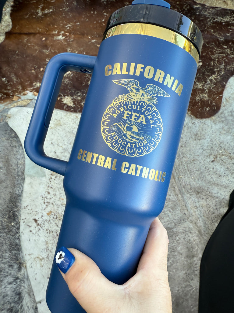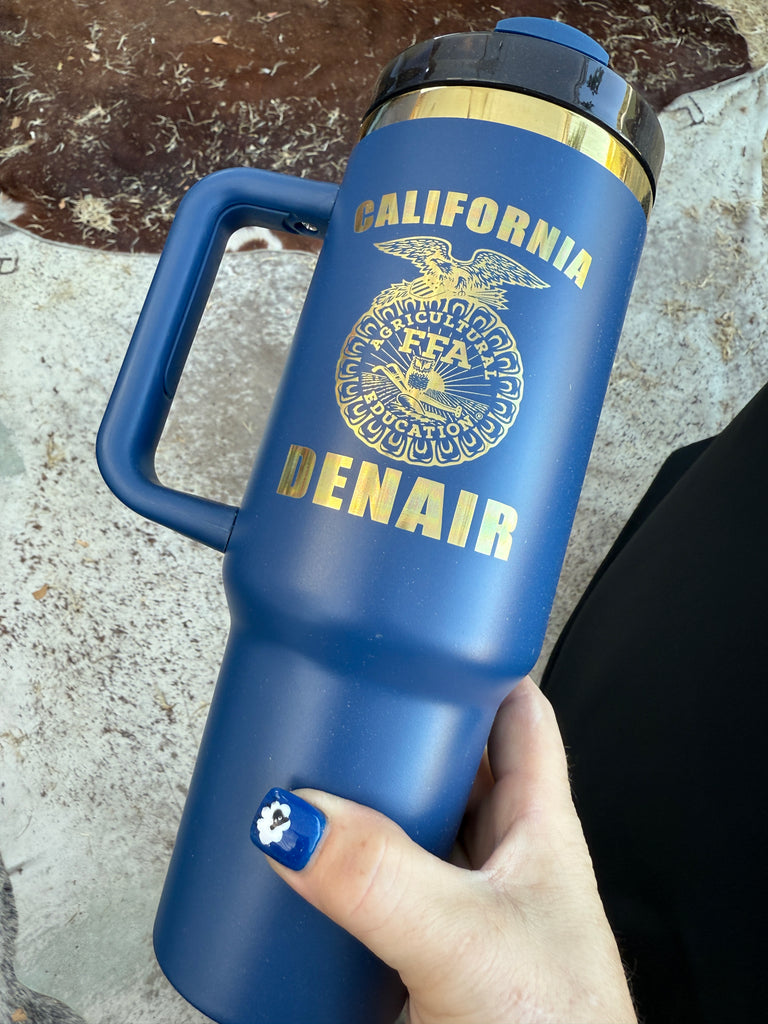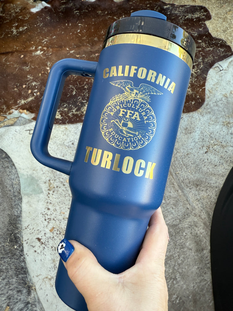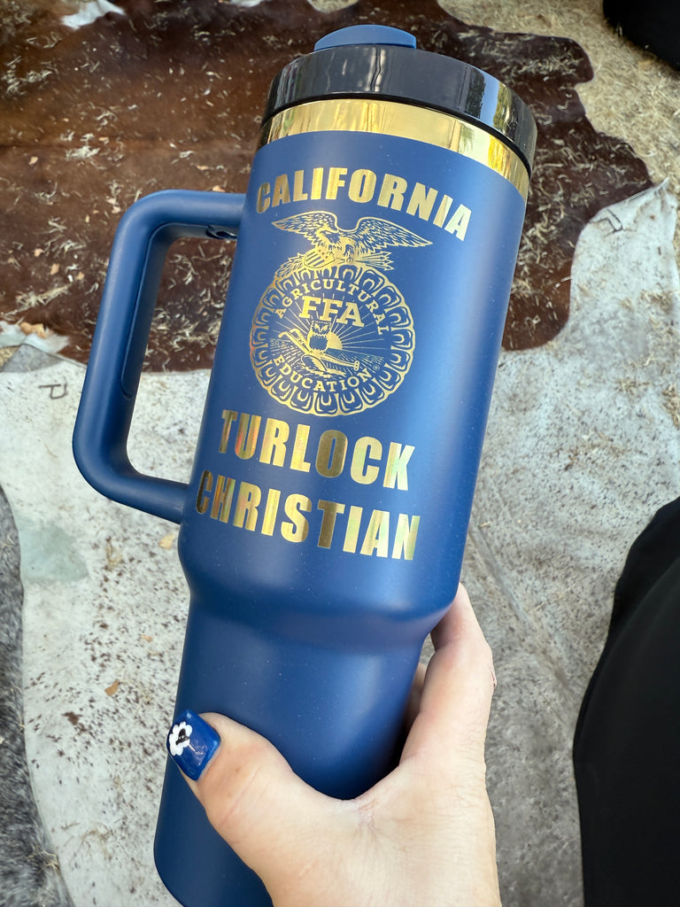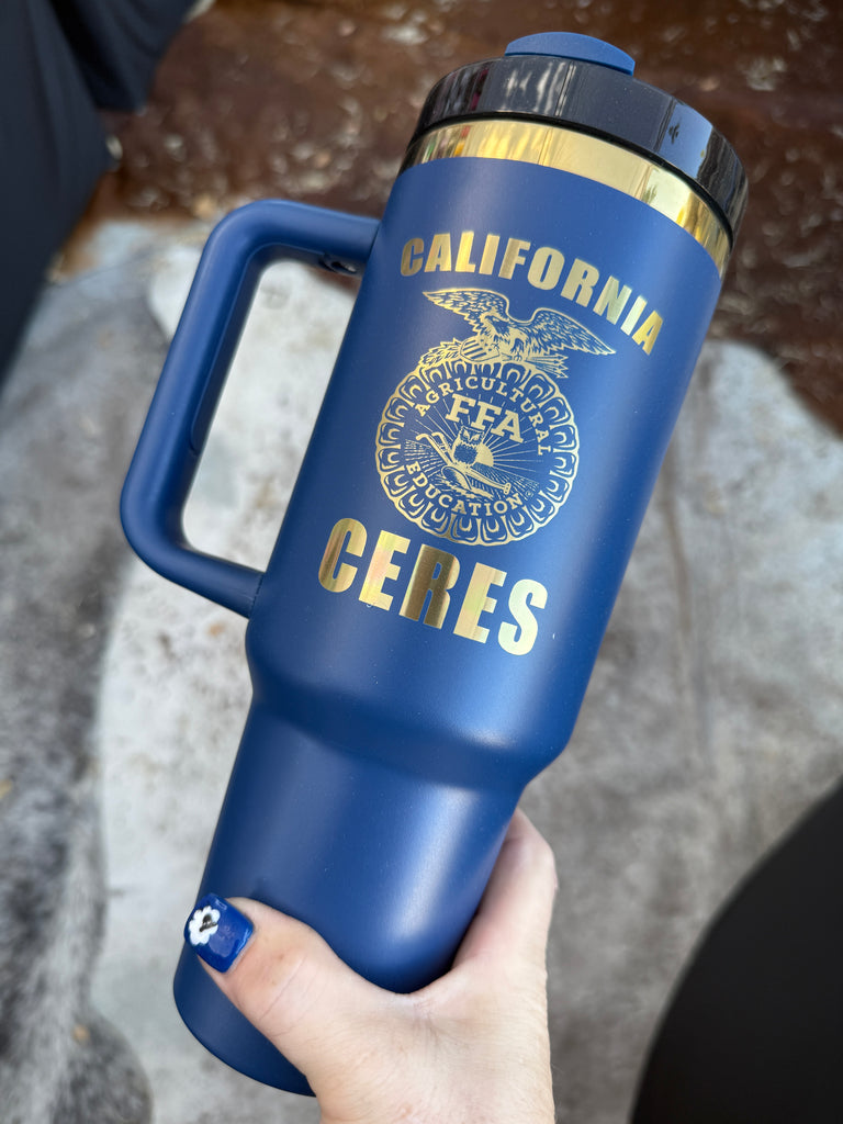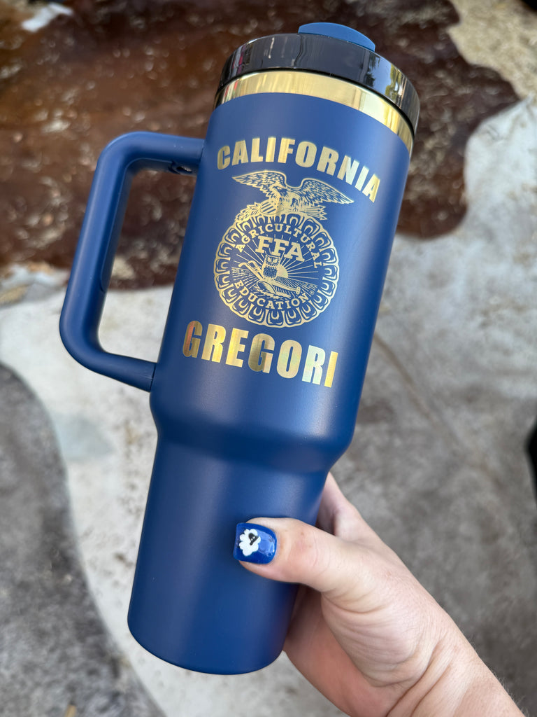 CUSTOM SCHOOL FFA Laser Engraved California FFA Blue & Gold 40oz TUMBLER Engraved Stanislaus County Fair