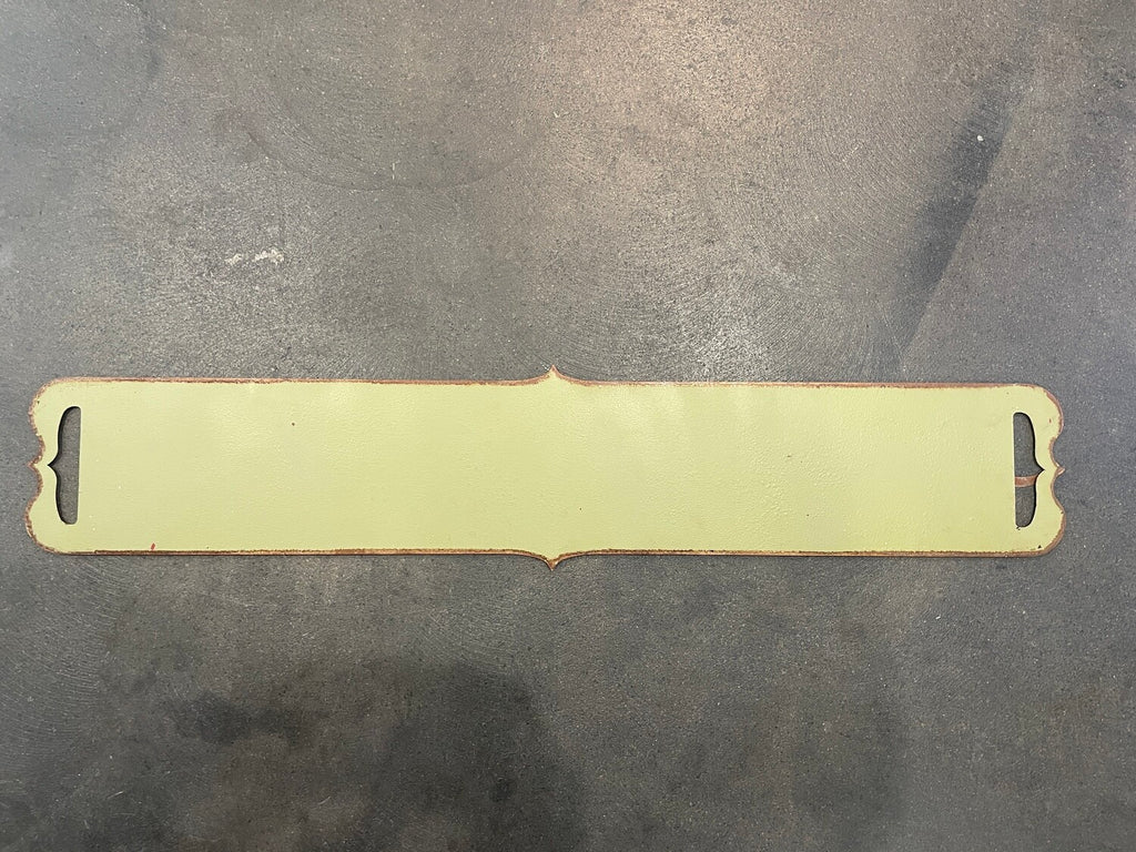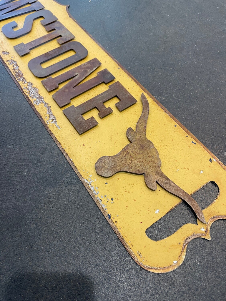 36" x 7" Custom Made double sided metal banner with Yellowstone & a longhorn steer on it with rustic metal letters on magnets. The custom made metal banner is a distressed yellow on one side and distressed sage green on the other. You can change these letters through the year by purchasing additional letters and symbols.