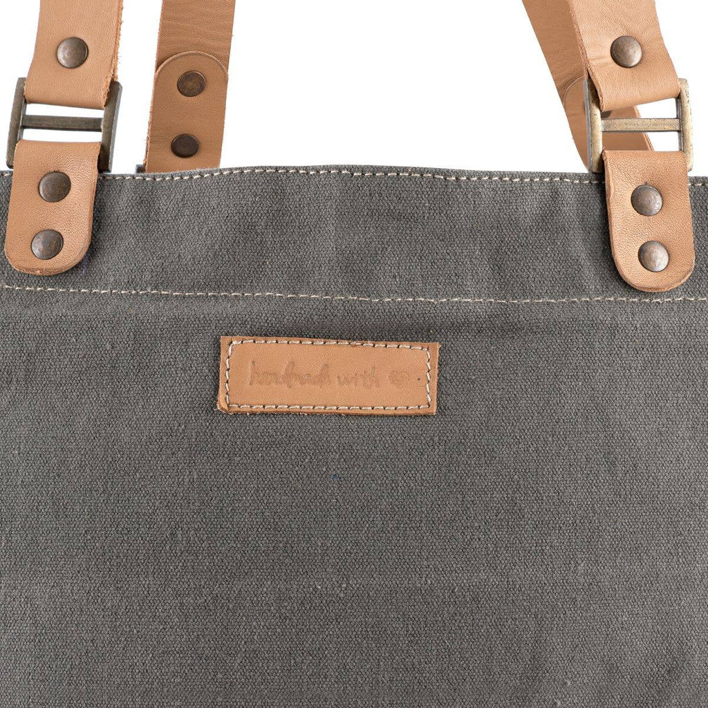 • Category: Up-cycled Canvas Bags • Sub Category: Tote Bag • Material :Canvas and Leather • Utility (Outside) : No pockets outside. • Utility (Inside) : Main compartment with 1 zip pocket & 2 slip pockets. • Lining: Poly Cotton Step Logo Printed • Collection : Vintage Saga • Fittings: Antique Finish Premium Hardware • Dimensions ( In Inches ) : 12.5 H x 16(12.5) W x 5 D • Handle : 10" Drop • Shoulder : N/A • Closure : Genuine YKK Zipper