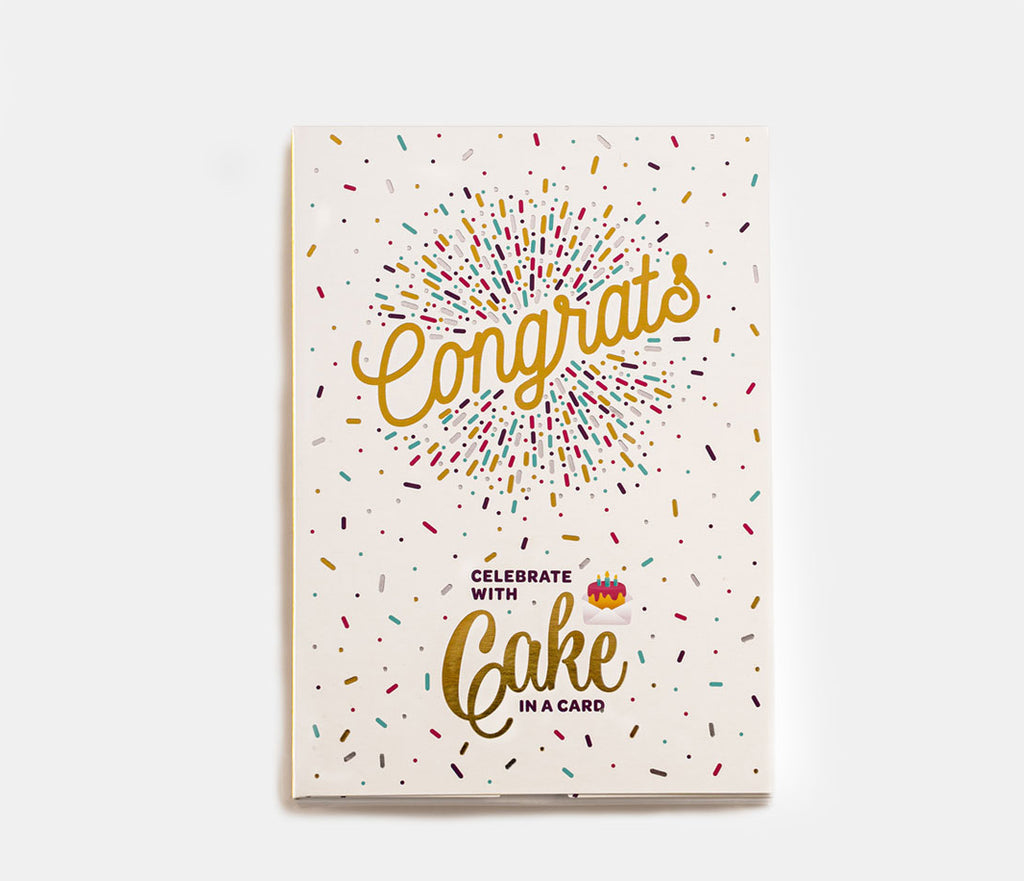 This our best selling Congrats card! Each card comes with everything you need to bake a delicious birthday card in minutes! Containing: cake mix, frosting, pop up baking case, water measure, mixing spoon, sprinkles, candle, cake topper & of course an envelope (fits through the mail slot!)