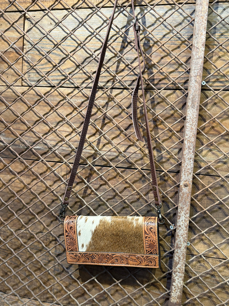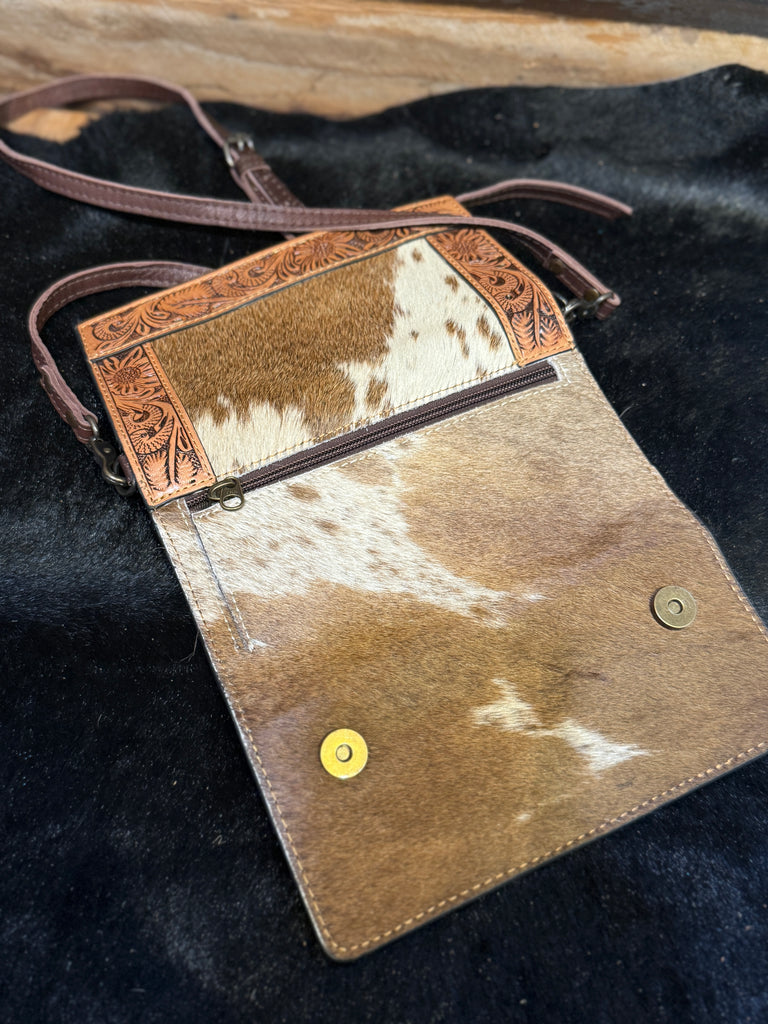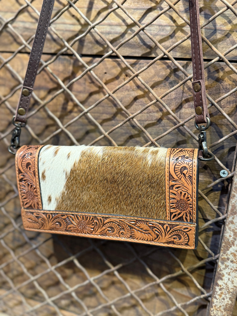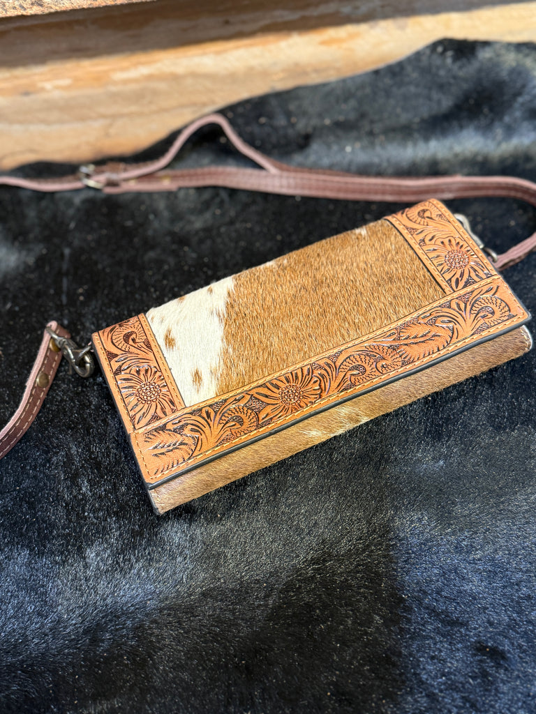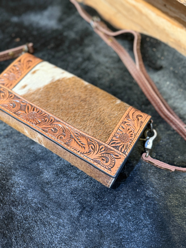 1A Western Hand Tooled Leather Cowhide Wallet Crossbody Bag