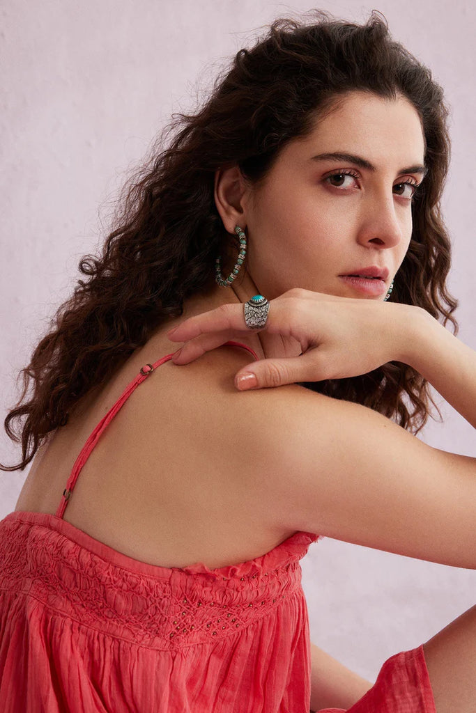 This gorgeous ring features a spectacular design, with detailed metalwork in a distinctive pattern. The silver-tone metal creates a timeless look. The single turquoise stone is embraced by a classis beaded pattern for just the right look. It's a stately ring you'll love pairing with your favorite fashions for just the right vibe.