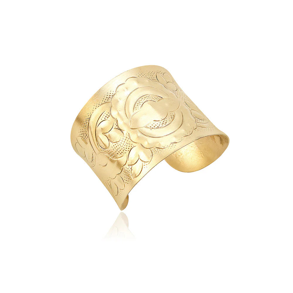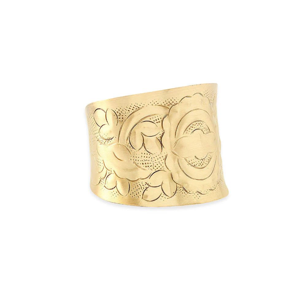 Embrace the golden glow of dawn with this stunning wide-band cuff featuring a blooming desert rose design. Like morning light catching the curves of sand dunes, this brushed brass beauty captures the warmth and romance of Southwest landscapes. An amazing accessory, perfect for the modern desert goddess!