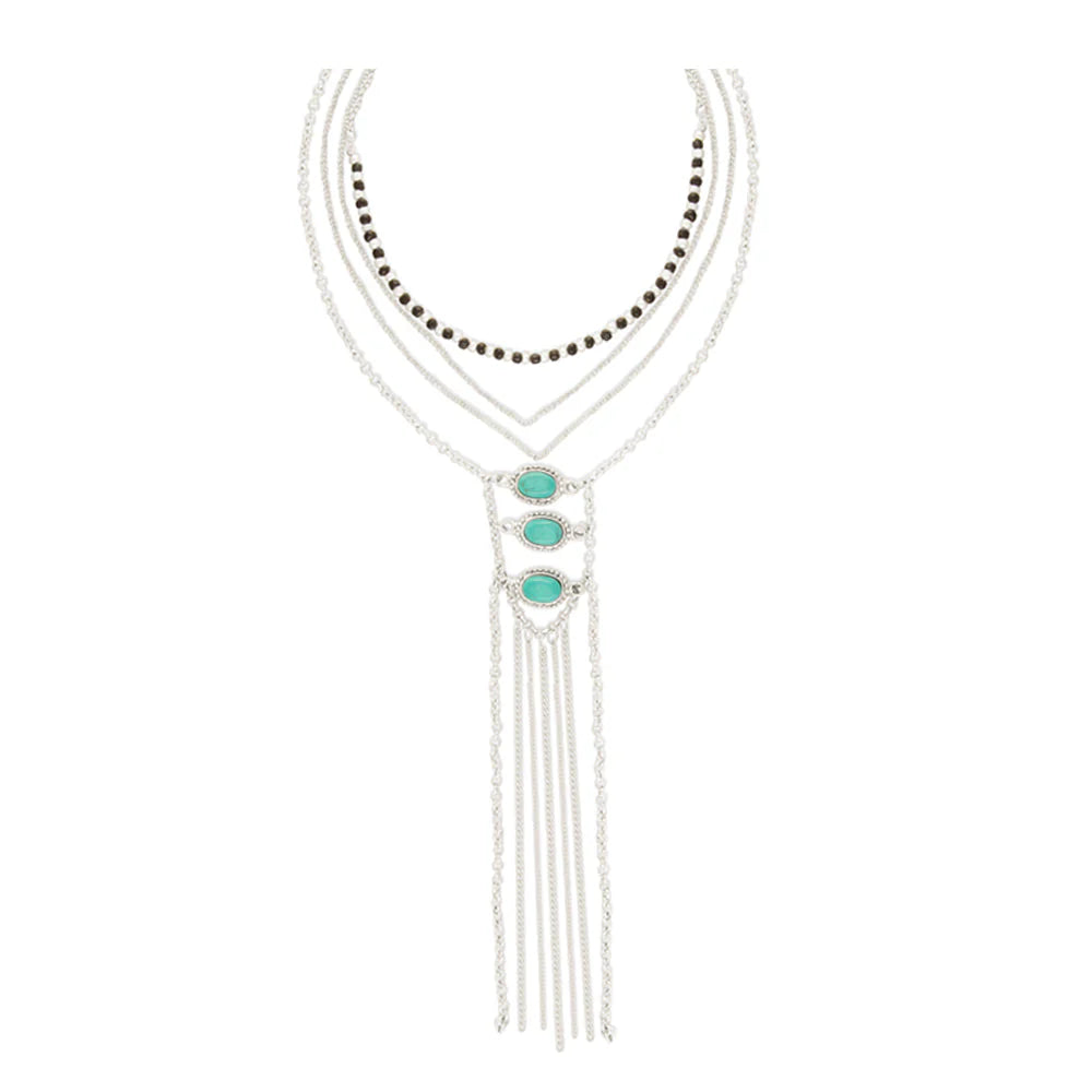 This beautiful four-strand necklace features wonderful beadwork and silver chains. A gorgeous stacked trio of faux turquoise stones completes this amazing piece.