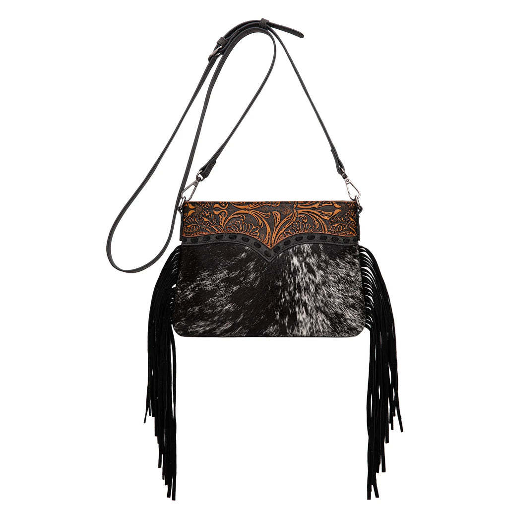 TR200-1814BK Black Cowhide Tooled Leather & Fringe Crossbody Purse