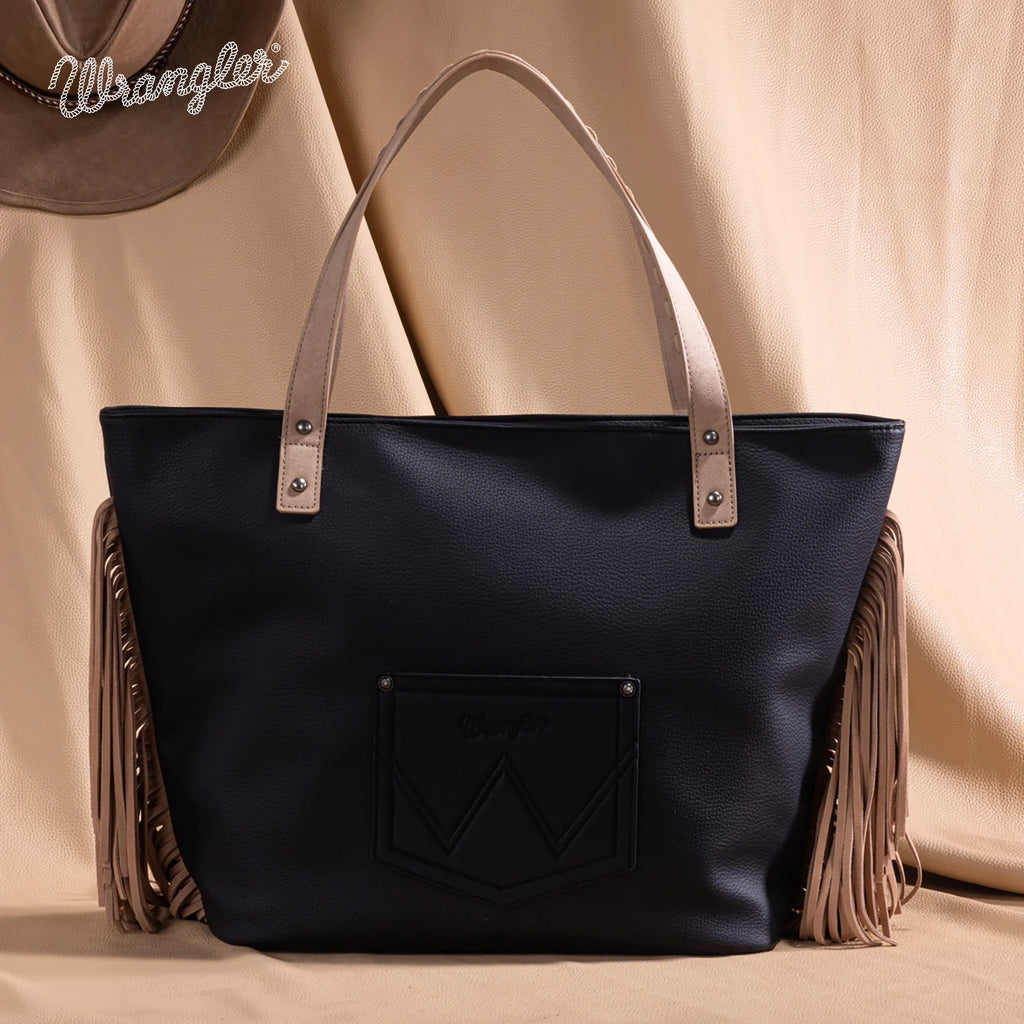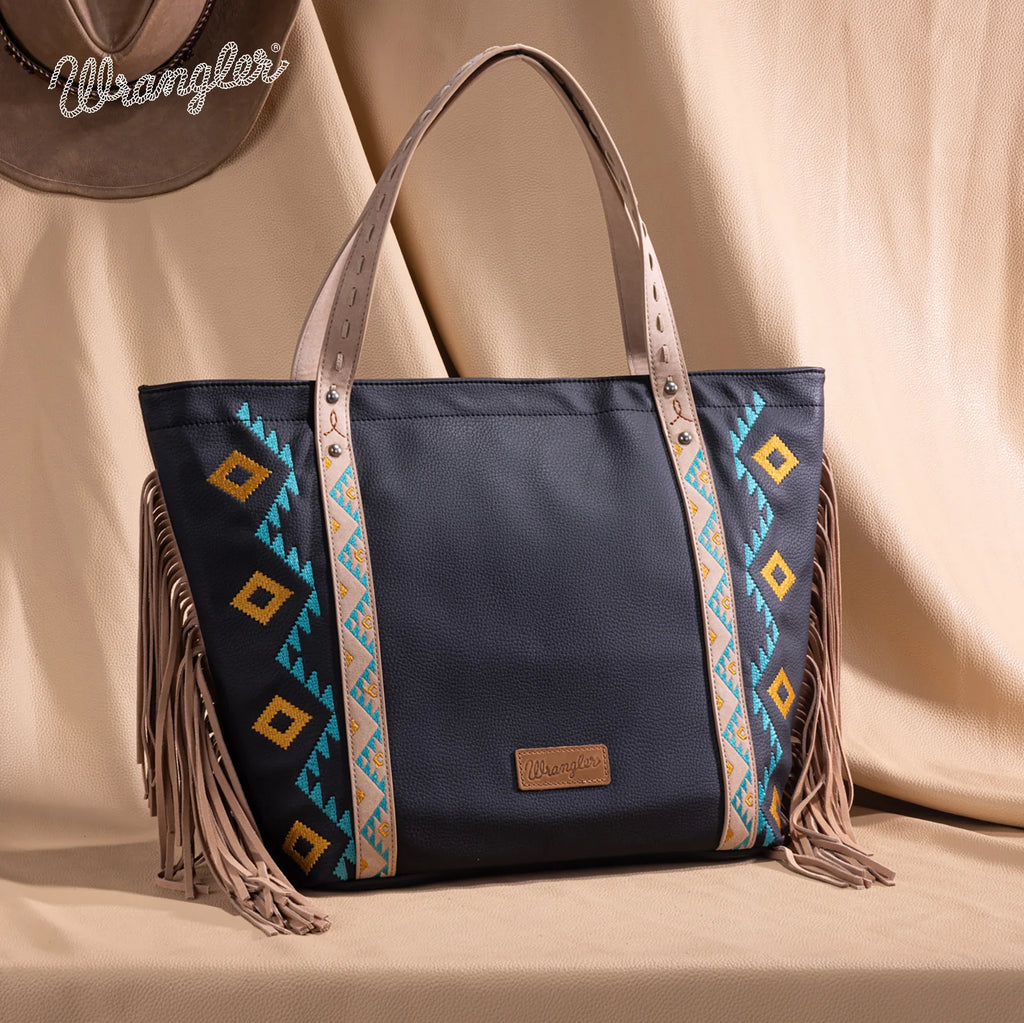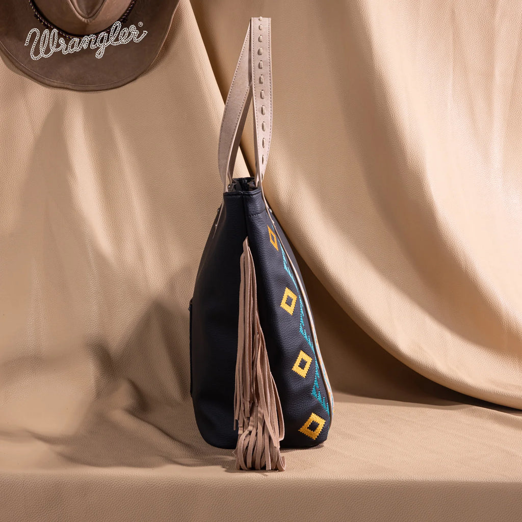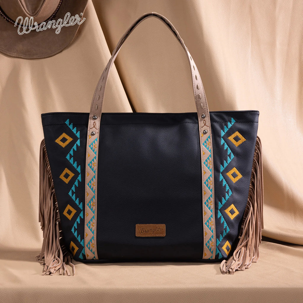 WG233-2002BK Black Wrangler Fringe Aztec Embroidered Large Tote Purse Shoulder Bag